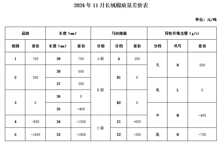 依據(jù)2024年10月的棉花公檢質(zhì)量數(shù)據(jù)、中國棉花協(xié)會棉花質(zhì)量價差自動生成系統(tǒng)采集的棉花加工企業(yè)銷售成交價、紡織企業(yè)監(jiān)測點(diǎn)的采集數(shù)據(jù)以及當(dāng)月的中國棉花價格指數(shù),并征求業(yè)內(nèi)相關(guān)專家的意見,現(xiàn)對2024年11月《中國棉花協(xié)會國產(chǎn)棉質(zhì)量差價表》做如下調(diào)整: