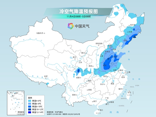 今天,冷空氣持續(xù)發(fā)力,降溫中心東移南壓,同時,中央氣象臺繼續(xù)發(fā)布大風(fēng)藍色預(yù)警。11月4日至5日,受強冷空氣影響,東北地區(qū)東部、華北中南部、黃淮、江漢等地氣溫將下降6~8℃,其中吉林東部、山東西北部等地局地降溫可達10℃左右。