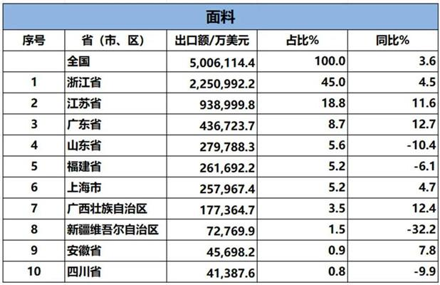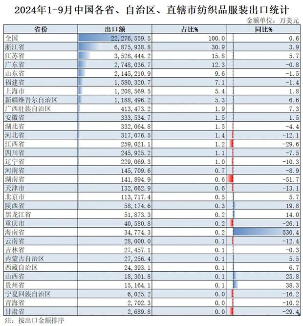 2024年1-9月,我國紡織服裝累計出口2227.66億美元,同比增長0.6%。內(nèi)地31個省、自治區(qū)、直轄市紡織服裝統(tǒng)計數(shù)據(jù)已出爐,浙江省、江蘇省、廣東省、山東省、福建省分別列全國紡織服裝出口省市前五位,合計比重超七成。