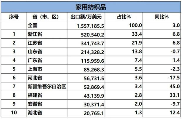 2024年1-9月紡織服裝類重點(diǎn)商品出口前十名的省(市、區(qū))