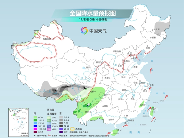 中央氣象臺預(yù)計(jì),今天,黑龍江東部、新疆北疆北部和南疆西部山區(qū)、西藏中部和東部、川西高原等地部分地區(qū)有小雪或雨夾雪,其中,西藏中部和東部、川西高原等地部分地區(qū)有中到大雪,西藏中東部、川西高原中東部等地局地暴雪。西藏東南部、云南中北部、四川中部和南部、重慶西部、海南島、臺灣島大部等地部分地區(qū)有小到中雨,其中,四川南部、臺灣島東北部等地部分地區(qū)有大雨。