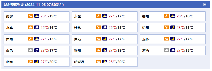 今天(11月6日)白天,廣西重回秋高氣爽,大部最高氣溫在23~28℃,體感還是比較舒適。預計明天,除了桂西北局地有小雨影響之外,廣西大部多云間晴。后天,桂北云量增多,有些分散小雨,桂南仍是多云天氣。受晴空輻射降溫影響,廣西晝夜溫差大,早晚時段涼意明顯,公眾需注意適時添衣保暖。天氣比較干燥,紫外線強,大家外出注意補水防曬。另外,各地應該利用好近期晴好的天氣條件,抓緊搶收成熟晚稻、玉米等秋收作物,并及時晾曬入庫。