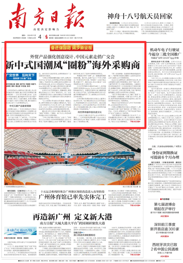 11月4日,廣東省委機(jī)關(guān)報(bào)《南方日報(bào)》采訪廣東省絲綢紡織集團(tuán)(以下簡稱絲紡集團(tuán))旗下高端品牌SILIQUE負(fù)責(zé)人蔡育萍,采訪圍繞中國風(fēng)元素在廣交會(huì)上的大放異彩以及SILIQUE品牌如何通過強(qiáng)化創(chuàng)意設(shè)計(jì)引領(lǐng)潮流等話題展開。值得一提的是,廣交會(huì)現(xiàn)場,一位俄羅斯采購商親自試穿了SILIQUE品牌的香云紗馬面裙,展現(xiàn)了品牌的國際吸引力與獨(dú)特魅力。