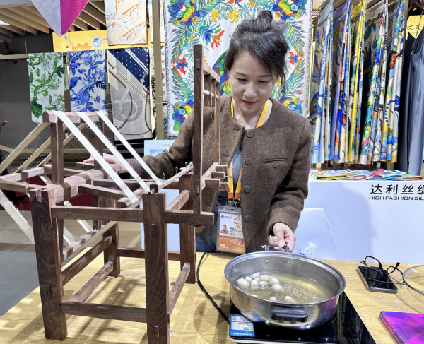走到達(dá)利絲綢(浙江)有限公司的展臺(tái),映入眼簾的是一臺(tái)土制手工繅絲機(jī)。工作人員現(xiàn)場(chǎng)向記者展示簡(jiǎn)易操作,觀眾紛紛通過動(dòng)手體驗(yàn),觀察如何從蠶繭中抽取蠶絲的全過程,體驗(yàn)非遺工藝無與倫比的魅力。當(dāng)蠶繭成熟后,蠶蛹會(huì)分泌一種特殊的液體,將自己周圍的繭絲黏合在一起。蠶蛹解絲后,工作人員將蠶繭現(xiàn)場(chǎng)烹煮,放入拉絲機(jī)中進(jìn)行拉伸,使其變得更細(xì)長(zhǎng)且均勻。