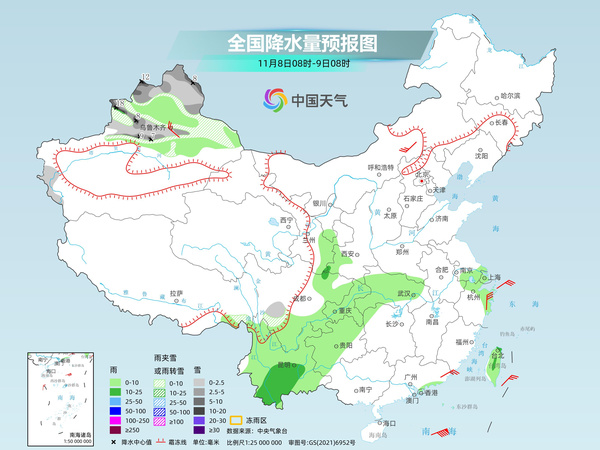預計今天,受冷空氣影響,新疆北部地區(qū)仍有強降雪;由于水汽條件轉(zhuǎn)差,西南地區(qū)的降雨將明顯減弱。其中新疆北部和西部、西藏東南部、川西高原南部等地部分地區(qū)有小到中雪或雨夾雪,其中,新疆阿勒泰山區(qū)、塔城、伊犁河谷和沿天山等地部分地區(qū)有大雪,局地暴雪。甘肅東南部、陜西西南部、四川東部和南部、重慶、云南、貴州北部和西部、湖北、江蘇南部、上海、浙江北部和東部、廣東東南沿海、臺灣島等地部分地區(qū)有小到中雨。