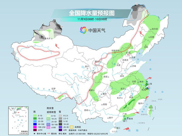 明天,新疆北部、內(nèi)蒙古東北部、黑龍江西北部等地部分地區(qū)有小到中雪或雨夾雪,其中,新疆阿勒泰、塔城、伊犁河谷及內(nèi)蒙古東北部、黑龍江西北部等地部分地區(qū)有大雪,局地暴雪。內(nèi)蒙古南部、黑龍江中西部、吉林中部、遼寧中部、河北北部、山西北部、陜西北部、甘肅南部、四川盆地西部、湖北中西部、河南南部、安徽北部、江蘇、上海、浙江、江西南部、福建北部和西部、廣東南部、臺灣島東部和北部等地部分地區(qū)有小到中雨,其中,浙江東北部局地有大雨。