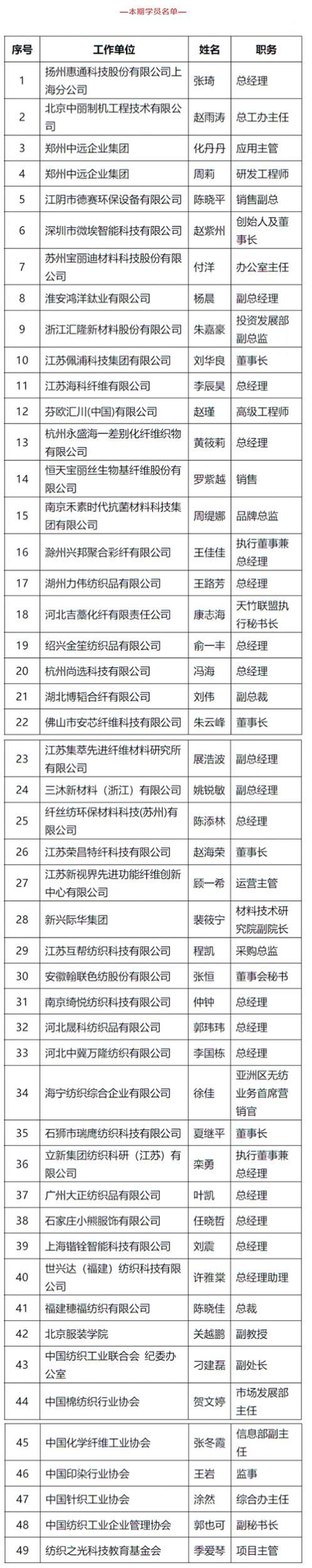 紡織高訓班由中國化學纖維工業(yè)協(xié)會、中國紡織工程學會、中國棉紡織行業(yè)協(xié)會、紡織人才交流培訓中心、北京服裝學院等共同組織主辦,自2015年開班至今,其已經(jīng)形成從紡織原料到機械設備、從纖維生產(chǎn)到紗線織造、從面料研發(fā)到終端品牌的完整的產(chǎn)業(yè)鏈教育體系,成為紡織全產(chǎn)業(yè)鏈交流信息、提升技術(shù)、共享資源、展望趨勢的大平臺,對促進企業(yè)發(fā)展、推進紡織產(chǎn)業(yè)鏈的融合起到積極作用。