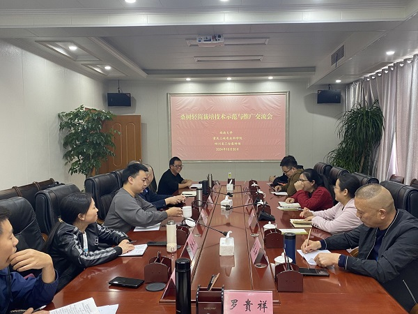 調(diào)研組先后實地考察省三臺蠶種場桑種質(zhì)資源圃、育苗基地、桑品種審定試驗地等,場長陳谷、崗位專家賈曉虎陪同。座談會上陳谷場長就單位目前桑種質(zhì)資源保存情況、桑品種創(chuàng)新利用、桑樹病蟲害綠色防控技術(shù)方向等做了詳細交流。王茜齡教授就四川省三臺蠶種場桑品種創(chuàng)新利用給予了高度評價,并提出應繼續(xù)加強雙方在桑種質(zhì)資源交流、創(chuàng)新利用上的合作。任杰群所長就四川省三臺蠶種場桑品種選育能力、桑園條件提出雙方可在桑園輕簡化栽培技術(shù)示范與推廣方面加強合作,同時表示愿與四川省三臺蠶種場就桑品種創(chuàng)新利用、示范推廣開展合作。