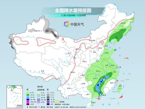 明天,內(nèi)蒙古河套地區(qū)、新疆北疆北部和北疆東部、西藏東部和北部、寧夏中北部、陜西北部等地部分地區(qū)有小到中雪或雨夾雪,其中,新疆北疆東部等地部分地區(qū)有大到暴雪,局地大暴雪(20~22毫米)。遼寧西部、華北中北部和南部、黃淮東部和西部、重慶中部、華南南部等地部分地區(qū)有中到大雨,其中,廣東東南部沿海等地部分地區(qū)有暴雨。