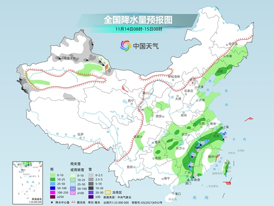 具體來看,今天新疆北部和西部山區(qū)等地部分地區(qū)有小到中雪或雨夾雪,其中,新疆阿勒泰山區(qū)、沿天山一帶和西部高海拔地區(qū)等地有大到暴雪。東北地區(qū)中南部、西北地區(qū)東部、西南地區(qū)東部、華北東部、黃淮東部、江淮、江漢、江南、華南中部、臺灣島等地部分地區(qū)有小到中雨,其中,浙江東部、江西北部和西部、廣東北部和南部沿海、臺灣島東南部等地部分地區(qū)有大雨,局地暴雨。