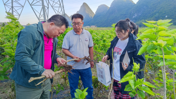11月8日下午,劉吉平一行在嘉聯(lián)公司常務(wù)副總經(jīng)理韋年光及宜州農(nóng)業(yè)農(nóng)村部門相關(guān)人員陪同下,首先到德勝鎮(zhèn)上坪村劉三姐桑蠶高效生態(tài)產(chǎn)業(yè)示范區(qū)嘉聯(lián)公司生產(chǎn)基地及周邊桑園,現(xiàn)場查看桑樹病蟲害的發(fā)生狀況,并現(xiàn)場采集了相關(guān)病害樣本。針對桑樹病蟲害的防控技術(shù),劉吉平采用通俗易懂的方式進(jìn)行了詳盡闡釋,特別著重強(qiáng)調(diào)了桑樹根結(jié)線蟲病防控的重要性,并提出了包括及時清園、消毒等在內(nèi)的多項(xiàng)解決方案。