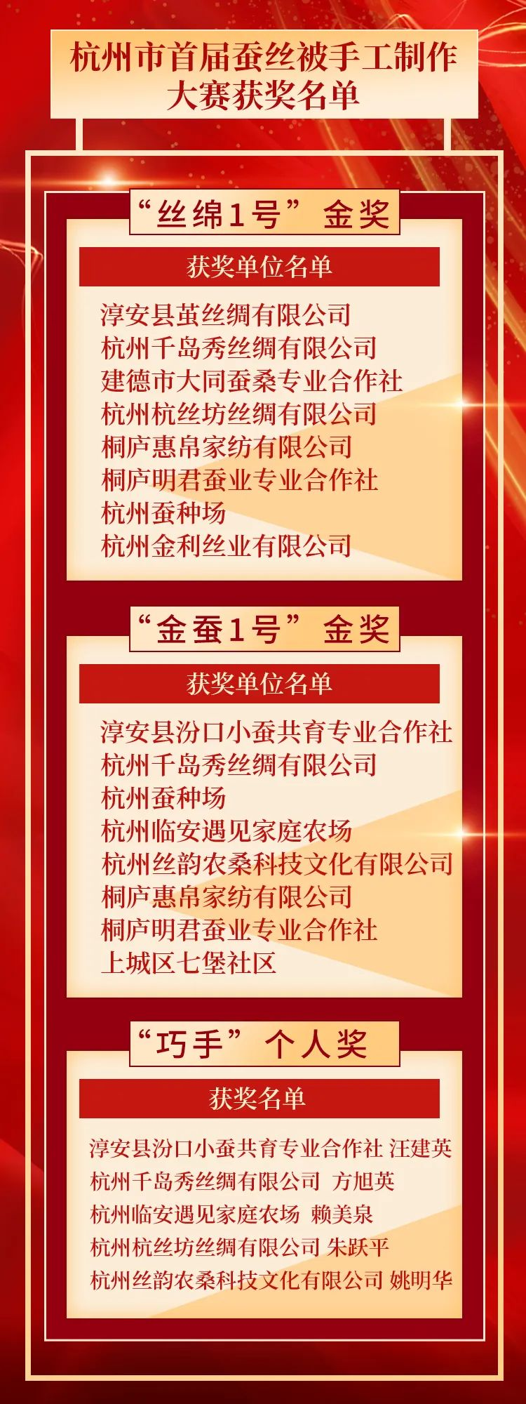 據(jù)中國蠶學(xué)會副理事長、浙江省蠶桑學(xué)會名譽(yù)理事長、評審組組長吳海平介紹,本次比賽評審主要著眼于疊網(wǎng)、整理、固定等環(huán)節(jié),從技藝熟練、鋪棉均勻、外觀規(guī)整、操作規(guī)范等多個指標(biāo),綜合團(tuán)隊(duì)配合默契度、完成效率等進(jìn)行打分,大賽最終決出絲棉1號金獎8個、金蠶1號金獎8個和巧手獎5個。