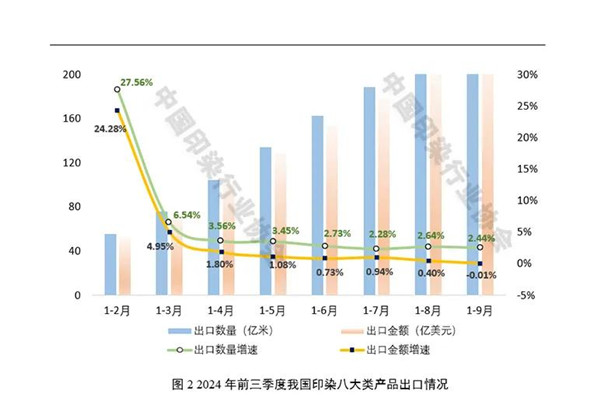 根據(jù)中國(guó)海關(guān)統(tǒng)計(jì)數(shù)據(jù),2024年1~9月,我國(guó)印染八大類(lèi)產(chǎn)品出口數(shù)量241.90億米,同比增長(zhǎng)2.44%,增速較上半年回落0.29個(gè)百分點(diǎn);出口金額227.21億美元,同比微降0.01%,增速較上半年回落0.74個(gè)百分點(diǎn);出口平均單價(jià)0.94美元/米,同比降低2.39%,降幅較上半年擴(kuò)大0.44個(gè)百分點(diǎn)。前三季度,我國(guó)主要印染產(chǎn)品出口呈現(xiàn)量升價(jià)跌態(tài)勢(shì),出口數(shù)量增速由年初的高速增長(zhǎng)逐步回落至目前的低增長(zhǎng)水平,出口金額累計(jì)增速持續(xù)放緩,9月份轉(zhuǎn)為負(fù)增長(zhǎng),出口平均單價(jià)創(chuàng)近十年同期新低,且降幅仍在擴(kuò)大,行業(yè)出口面臨較大的競(jìng)爭(zhēng)壓力。