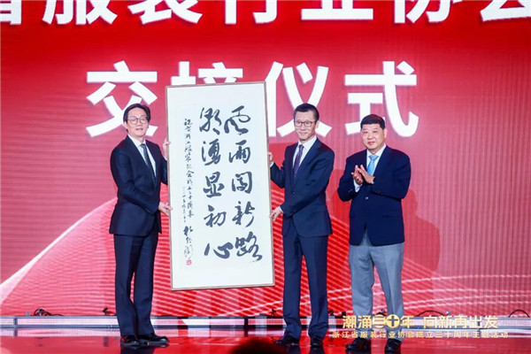 在隨后進(jìn)行的新老會(huì)長(zhǎng)交接儀式上,中國(guó)紡織工業(yè)聯(lián)合會(huì)副會(huì)長(zhǎng)、中國(guó)服裝協(xié)會(huì)會(huì)長(zhǎng)陳大鵬,浙江服裝行業(yè)協(xié)會(huì)第七屆會(huì)長(zhǎng)馮德虎共同將一幅由中國(guó)紡織工業(yè)聯(lián)合會(huì)原會(huì)長(zhǎng)杜鈺洲親筆題寫的“風(fēng)雨闖新路,潮涌顯初心”的墨寶交到新任會(huì)長(zhǎng)鄭念華手中。這一莊重的交接儀式,不僅是對(duì)老一輩服裝人的崇高敬意,更是對(duì)新一代服裝人的殷切期望與重托。