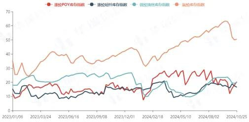 庫(kù)存方面,滌綸長(zhǎng)絲庫(kù)存同比有所增加,二、三季度POY高位近一個(gè)月,F(xiàn)DY高位在22天左右,9月底庫(kù)存相對(duì)低位,10月在工廠負(fù)荷提升下,庫(kù)存開始回升。氨綸庫(kù)存1~9月持續(xù)升高,最高點(diǎn)達(dá)60天以上,但10月以來(lái),庫(kù)存去化:一方面,氨綸價(jià)格降至底部,進(jìn)入盤整期,市場(chǎng)對(duì)原料心態(tài)有所好轉(zhuǎn);另一方面,氣候轉(zhuǎn)冷,織造業(yè)、服裝業(yè)開始進(jìn)入快速生產(chǎn)周期。此外,滌綸短纖、錦綸上半年庫(kù)存壓力不大,但三季度庫(kù)存增加;粘膠短纖庫(kù)存整體處于低位水平。