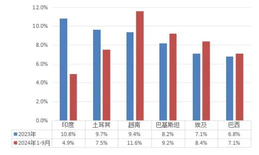 分出口目的地看,化纖出口市場(chǎng)份額變化明顯,1~9月出口越南占比11.6%,較去年全年提升2.2個(gè)百分點(diǎn);出口印度占比4.9%,較去年全年下降5.9個(gè)百分點(diǎn);出口土耳其占比7.5%,較去年全年下降2.2個(gè)百分點(diǎn)(圖4)。此外,聚酯瓶片出口恢復(fù)增長(zhǎng)態(tài)勢(shì),同比增長(zhǎng)28.31%,出口占比約37%。同期,化纖進(jìn)口量同比增加5.23%,但數(shù)量?jī)H占化纖產(chǎn)量的0.6%。