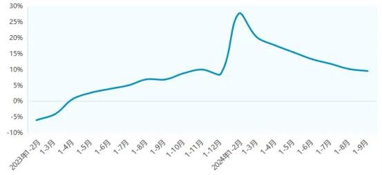 據(jù)國(guó)家統(tǒng)計(jì)局?jǐn)?shù)據(jù),2024年1-9月化纖產(chǎn)量5860萬(wàn)噸,同比增長(zhǎng)9.53%(圖1)。從環(huán)比看,增速呈現(xiàn)逐步回落態(tài)勢(shì):三季度產(chǎn)量同比增長(zhǎng)2.90%;二季度產(chǎn)量同比增長(zhǎng)7.61%;一季度產(chǎn)量同比增長(zhǎng)20.12%。