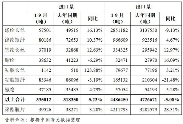 表2 2024年1-9月化纖主要產(chǎn)品進(jìn)出口情況