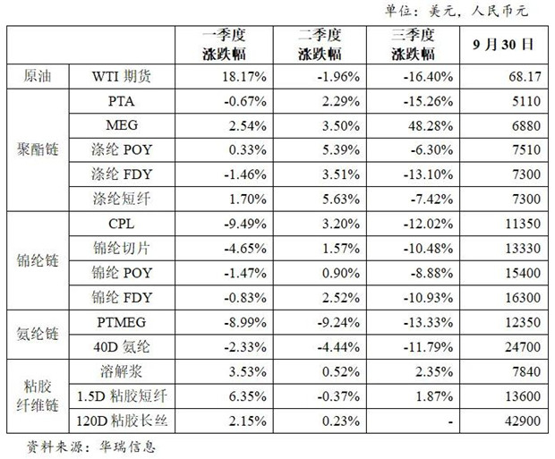 分產(chǎn)業(yè)鏈看,聚酯鏈、錦綸鏈三季度跌幅較為明顯;氨綸鏈基本處于下跌趨勢(shì);粘膠纖維產(chǎn)業(yè)鏈表現(xiàn)較好,呈現(xiàn)小幅上漲趨勢(shì)(表1)。