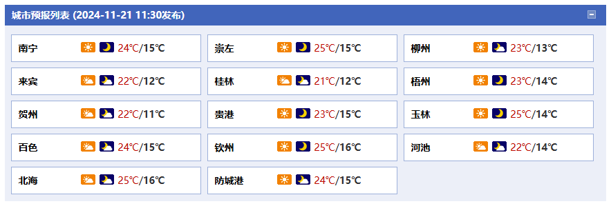 23日晚上到24日白天,全區(qū)多云到陰天,其中桂北和桂東南有分散小雨。