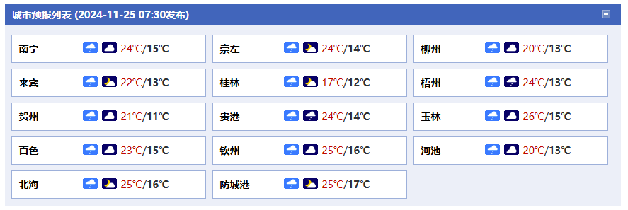 南寧市:今天白天陰天有小雨,今天晚上陰天、局部有小雨,東北風2~3級、陣風6~7級,最高氣溫24℃,最低氣溫15℃。
