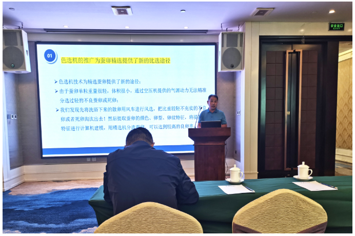 諶倫富高級農(nóng)藝師主要分享了《一種基于蠶卵特征的精選方法的研究》,該方法以提高蠶種良卵率為目標(biāo),以蠶卵的物理特征(比重、顏色、卵型、卵紋等)為分類標(biāo)準(zhǔn)建立分類模型,結(jié)合計(jì)算機(jī)高效算法,為家蠶一代雜交種散卵分選提供了一種既環(huán)保又高效的新途徑,這項(xiàng)首創(chuàng)技術(shù)極大地提高了家蠶的良卵率,從而為高效蠶業(yè)提供優(yōu)質(zhì)種源基礎(chǔ)保障。