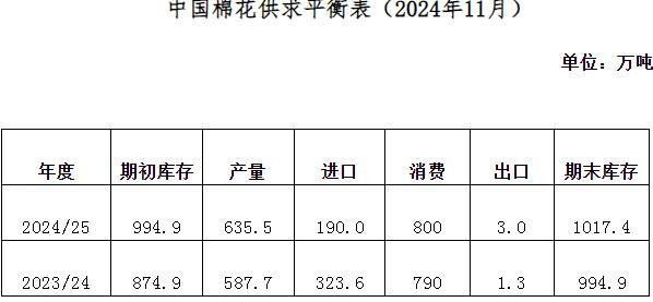 10月,在國(guó)家一系列經(jīng)濟(jì)刺激政策和雙11促銷季等因素影響下,棉紡織行業(yè)需求略有改善,隨著新棉大量上市,棉花價(jià)格逐漸從高位回落。月內(nèi)全國(guó)棉花采收進(jìn)入高峰期,進(jìn)度較上年明顯提前,市場(chǎng)心態(tài)趨于理性,收購(gòu)價(jià)格雖同比大幅下跌,但收購(gòu)秩序總體穩(wěn)定。新疆棉花豐產(chǎn)已成定局,期末庫(kù)存水平較高,預(yù)計(jì)全年度棉花供給仍然寬松,棉紡織行業(yè)季節(jié)性好轉(zhuǎn)可持續(xù)性不足,隨著淡季來(lái)臨,訂單出現(xiàn)下滑趨勢(shì),企業(yè)經(jīng)營(yíng)壓力仍然較大。中國(guó)棉花協(xié)會(huì)11月預(yù)測(cè):2024/25年度,全國(guó)棉花產(chǎn)量635.5萬(wàn)噸,較上期上調(diào)15.4萬(wàn)噸,同比增長(zhǎng)8.1%;棉花進(jìn)口量190萬(wàn)噸,同比下降41.3%;消費(fèi)量800萬(wàn)噸,同比增長(zhǎng)1.3%;期末庫(kù)存1017.4萬(wàn)噸,同比增長(zhǎng)2.3%。