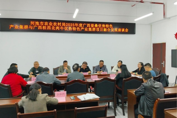 25日,座談會在河池市農(nóng)業(yè)農(nóng)村局會議室召開,會議旨在推進(jìn)廣西桑蠶優(yōu)勢特色產(chǎn)業(yè)集群與廣西桂西北肉牛優(yōu)勢特色產(chǎn)業(yè)集群項(xiàng)目協(xié)同合作發(fā)展。會上,專家針對兩個(gè)產(chǎn)業(yè)集群,提出以桑枝飼料化和肉牛高值化為抓手來開展兩個(gè)項(xiàng)目深度協(xié)同融合發(fā)展的建議。同時(shí)雙方就深度開展校政合作進(jìn)行了友好協(xié)商。