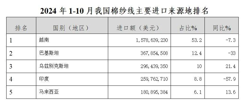從大類產(chǎn)品看,2024年1-10月進(jìn)口棉紗線29.7億美元,同比下降17.7%,進(jìn)口數(shù)量124.4萬(wàn)噸,同比下降9.8%;進(jìn)口化纖11.9億美元,同比上漲3.4%;進(jìn)口絲線和羊毛、動(dòng)物紗線分別為292.9萬(wàn)美元和1.1億美元,同比增長(zhǎng)47%和14.4%。我國(guó)紗線進(jìn)口以棉紗線為主,占紗線進(jìn)口總額的70%。