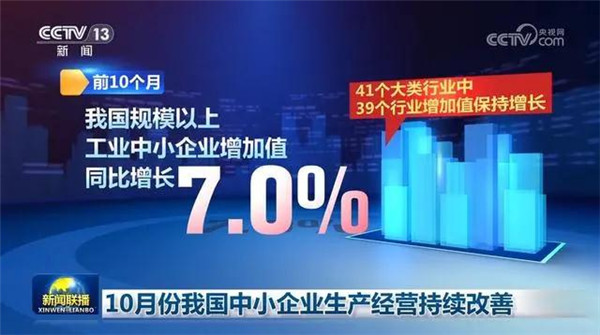 前10個月,我國規(guī)模以上工業(yè)中小企業(yè)增加值同比增長7.0%。其中,41個大類行業(yè)中39個行業(yè)增加值保持增長,有力支撐工業(yè)經濟平穩(wěn)增長。10月份,中小企業(yè)生產指數為50.7%,連續(xù)6個月處于擴張區(qū)間。