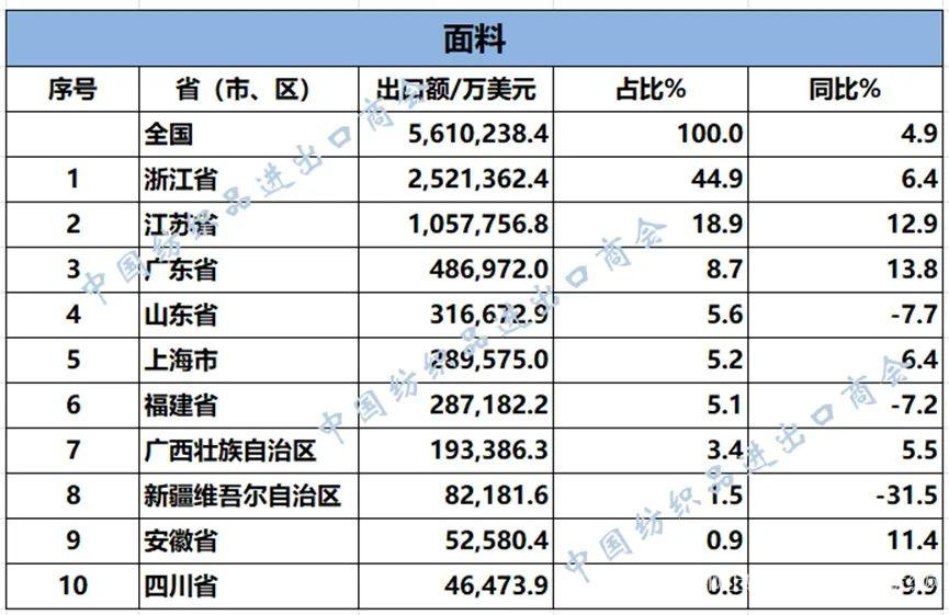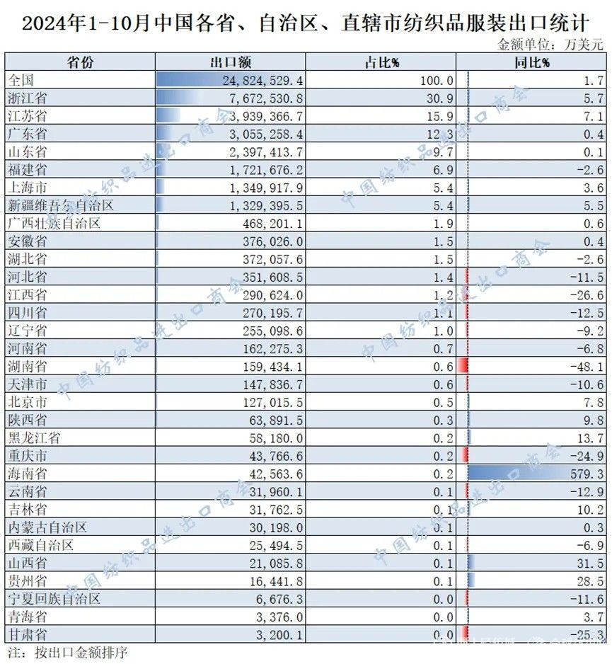 2024年1-10月,我國紡織服裝累計出口2482.45億美元,同比增長1.7%。內(nèi)地31個省、自治區(qū)、直轄市紡織服裝統(tǒng)計數(shù)據(jù)已出爐,浙江省、江蘇省、廣東省、山東省、福建省分別列全國紡織服裝出口省市前五位,合計比重超七成。
