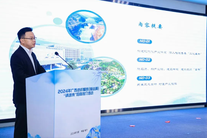 11月28日, 2024年廣西紡織服裝(繭絲綢)產(chǎn)業(yè)“請(qǐng)進(jìn)來(lái)”招商推介活動(dòng)在南寧市成功舉辦。此次活動(dòng)由廣西壯族自治區(qū)工業(yè)和信息化廳聯(lián)合南寧、梧州、河池、百色、來(lái)賓市人民政府主辦。四川省絲綢協(xié)會(huì)組織四川省絲綢科學(xué)研究院、寧南縣南絲路集團(tuán)有限公司、成都一和海悅絲綢有限公司等科研院所、龍頭企業(yè)代表、供應(yīng)鏈企業(yè)代表參加招商對(duì)接活動(dòng)。