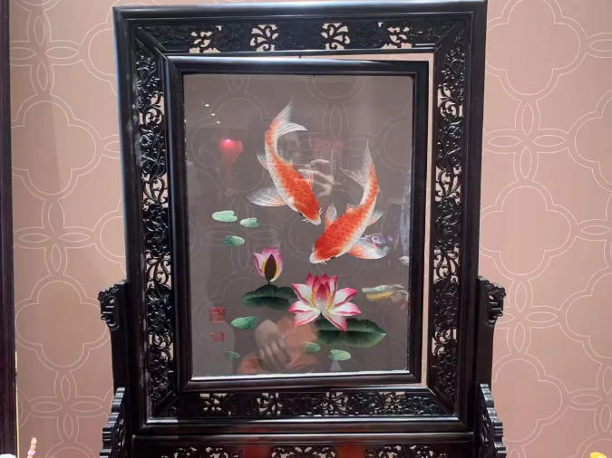 眾多作品中,雙面異色睡蓮錦鯉備受關(guān)注,該作品為“中華文化”系列雙面異色蜀繡藝術(shù)擺件。蜀繡畫面中兩條錦鯉在蓮花池中嬉戲。正面睡蓮為粉白色,或嬌艷盛開,或含苞欲放,背面睡蓮色彩依舊,水中鯉魚的顏色卻由紅色變成黑色,旋轉(zhuǎn)之間,美輪美奐,寓意“年年有余、幸福美滿”。