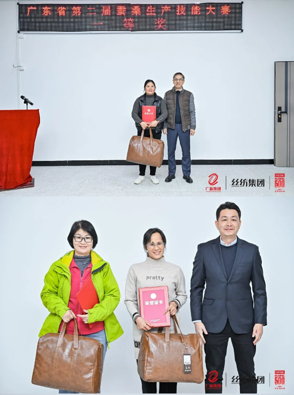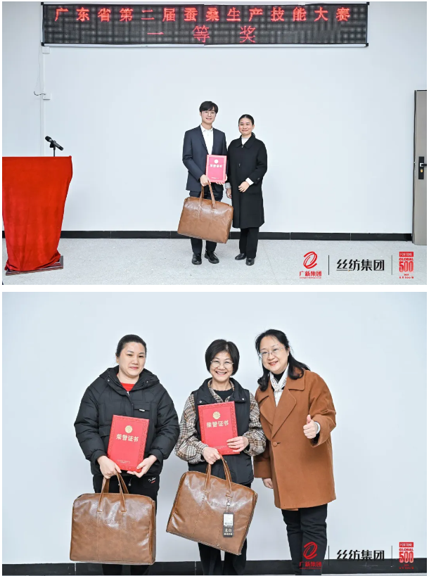 翁源縣總工會(huì)副主席鐘燕梅,廣新集團(tuán)工會(huì)副主席陳佳,絲紡集團(tuán)黨委副書記、董事、紀(jì)委書記段彬心,黨委委員、副總經(jīng)理梁駿,廣東省蠶學(xué)會(huì)理事長邱國祥出席大賽。