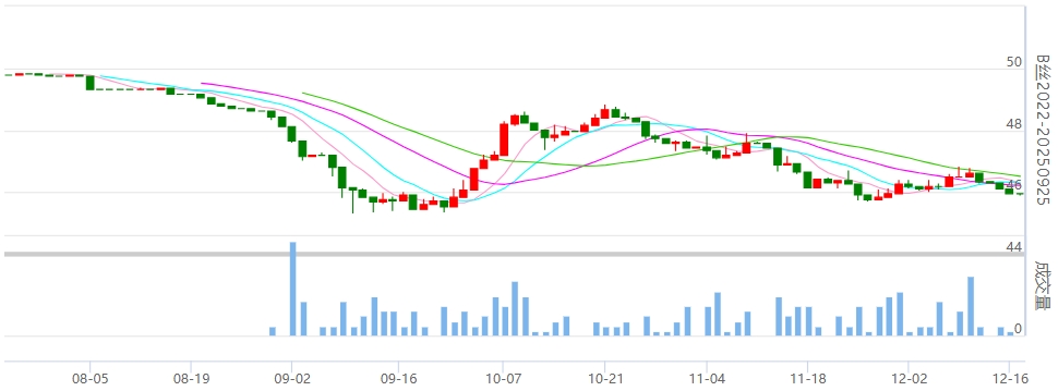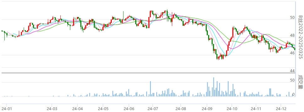 今日(2024年12月17日,周二)中國繭絲綢交易市場生絲電子指數(shù)下跌0.15%收于4673.57點。B絲2022D(商檢4A級生絲):241225合約下跌0.06萬元報收于47.55萬元;250325合約下跌0.15萬元報收于46.62萬元;250925合約下跌0.03萬元報收于45.96萬元。