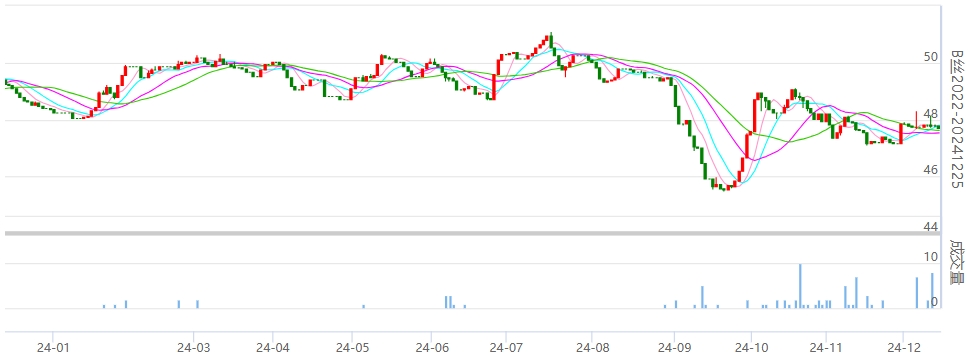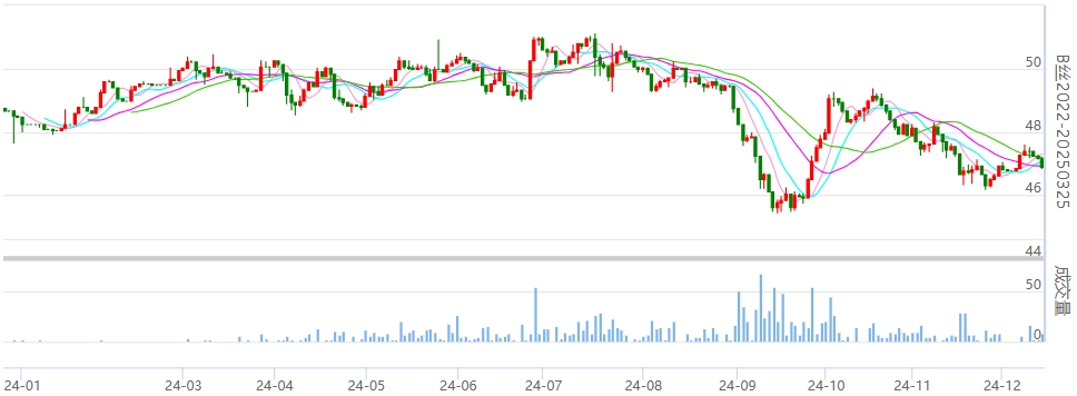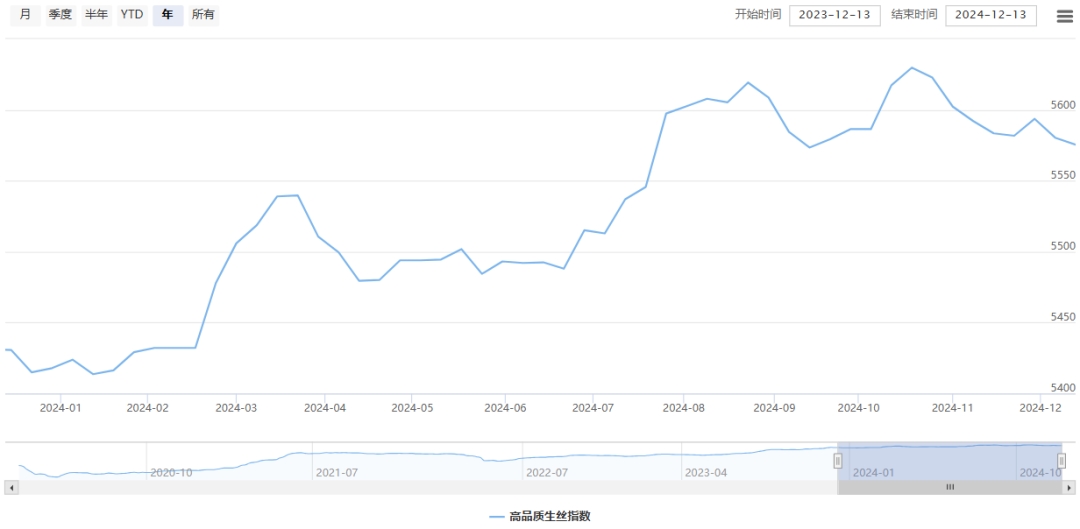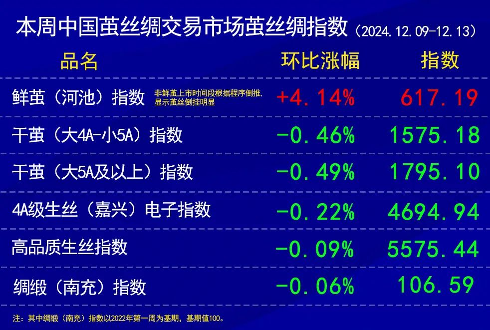 今日(2024年12月13日,周五)中國繭絲綢交易市場生絲電子指數下跌0.26%收于4694.94點,本周生絲指數下跌0.22%。B絲2022D(商檢4A級生絲):241225合約下跌0.09萬元報收于47.70萬元;250325合約下跌0.27萬元報收于46.89萬元;250925合約下跌0.18萬元報收于46.14萬元。