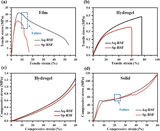 為了證明Sp-RSF粉末形成SF基材料的能力。通過溶解Sp-RSF粉末,制備了Sp-RSF基薄膜、水凝膠和固體。Sp-RSF基材料的力學性能及破壞過程與由新鮮 HMWRSF 水溶液制成的基于Aq-RSF 的材料相似(圖3)。