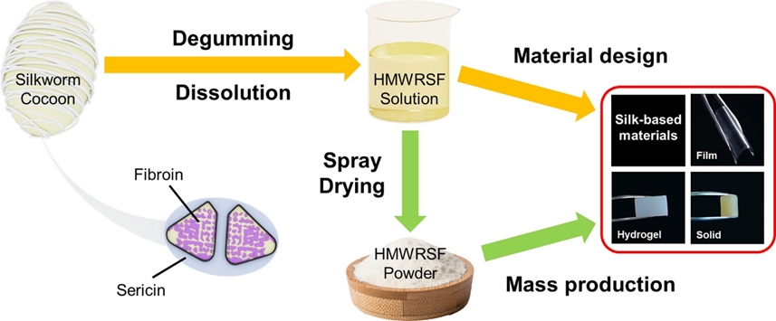 在這項研究中,報道了通過專門的噴霧干燥方法實現(xiàn)的高分子量可溶性和穩(wěn)定的Sp-RSF粉末。我們發(fā)現(xiàn)水-蛋白質(zhì)關(guān)系對Sp-RSF粉末的制備和加工至關(guān)重要。在制備過程中,低溫下的快速水分蒸發(fā)限制了SF的構(gòu)象轉(zhuǎn)變和降解。Sp-RSF鏈在干燥狀態(tài)下的低遷移率也賦予了Sp-RSF粉末長期穩(wěn)定性。在加工中,材料制造的先決條件是增強Sp-RSF的流動性。除了溶解之外,還展示了一種水輔助成型方法來制造蠶絲板。水分的引入促進了Sp-RSF的流動性和粉末在低成型溫度下的熔融。與熱成型方法相比,我們的方法減輕了絲素蛋白熱降解對生物相容性的潛在風險。本研究可為基于水和Sp-RSF粉末組合的新方法的開發(fā)提供指導。我們相信,從新源材料和新加工方法的角度來看,Sp-RSF粉末可能有助于蠶絲基材料邁入新階段。