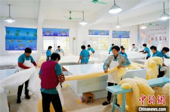 浙江蠶緣家紡有限公司,工作人員在制作蠶絲被。桐鄉(xiāng)市傳媒中心供圖