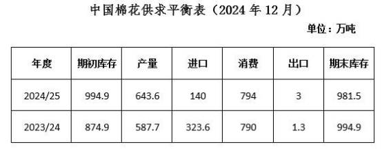 中國(guó)棉花協(xié)會(huì)12月預(yù)測(cè):2024/25年度,全國(guó)棉花產(chǎn)量643.6萬(wàn)噸,同比增長(zhǎng)9.5%,根據(jù)新棉采收與加工量測(cè)算,將新疆棉花產(chǎn)量上調(diào)至610.4萬(wàn)噸,較上期上調(diào)8.1萬(wàn)噸,內(nèi)地未做調(diào)整;棉花進(jìn)口量140萬(wàn)噸,同比下降56.7%,較上期下調(diào)50萬(wàn)噸,主要是國(guó)內(nèi)資源供給較為充裕,進(jìn)口預(yù)期減少;消費(fèi)量794萬(wàn)噸,同比基本持平,較上期下調(diào)6萬(wàn)噸,新年度以來(lái)棉紡織需求較弱,不及先前預(yù)期;期末庫(kù)存相應(yīng)調(diào)整為981.5萬(wàn)噸,同比下降0.1%。