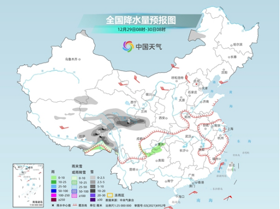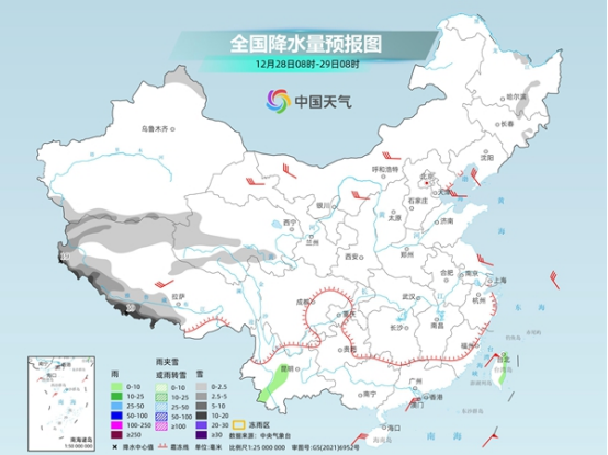 中央氣象臺預計,今天,西藏西部、新疆西南部、川西高原東部、貴州西部、內蒙古東北部等地部分地區(qū)有小雪或雨夾雪,其中,西藏西部部分地區(qū)有中到大雪,局地暴雪。湖北西南部、四川盆地南部、重慶中部、貴州東北部和西部、云南東部、廣西西北部、海南島中東部、臺灣島等地部分地區(qū)有小雨。