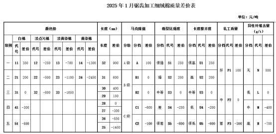 根據(jù)《中國(guó)棉花協(xié)會(huì)國(guó)產(chǎn)棉質(zhì)量差價(jià)表管理辦法》規(guī)定,現(xiàn)正式發(fā)布2025年1月《鋸齒加工細(xì)絨棉質(zhì)量差價(jià)表》、《皮輥加工細(xì)絨棉質(zhì)量差價(jià)表》和《長(zhǎng)絨棉質(zhì)量差價(jià)表》(單位:元/噸)。