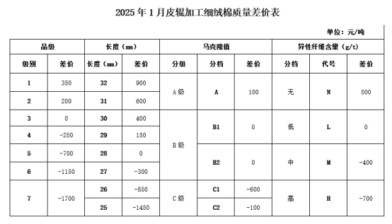 依據(jù)2024年12月的棉花公檢質(zhì)量數(shù)據(jù)、中國(guó)棉花協(xié)會(huì)質(zhì)量?jī)r(jià)差系統(tǒng)采集的加工企業(yè)銷售價(jià)和紡織企業(yè)到廠價(jià),以及當(dāng)月的中國(guó)棉花價(jià)格指數(shù),并征求業(yè)內(nèi)相關(guān)專家的意見(jiàn),與上月相比,做如下調(diào)整: