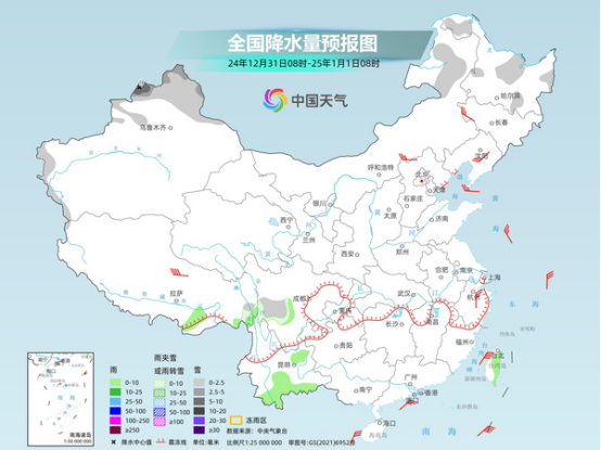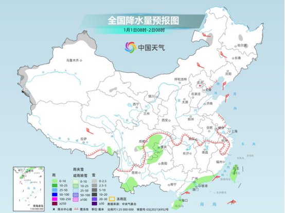 元旦當(dāng)天,新疆北部和西部山區(qū)、川西高原東部、內(nèi)蒙古東北部、黑龍江中部等地部分地區(qū)有小雪或雨夾雪,其中,新疆西部高海拔山區(qū)部分地區(qū)有中到大雪,局地暴雪。西藏東南部、四川東部、重慶西部、貴州西北部、云南南部、廣東南部、海南島、臺(tái)灣島等地部分地區(qū)有小雨,其中,臺(tái)灣島中部部分地區(qū)有中雨。