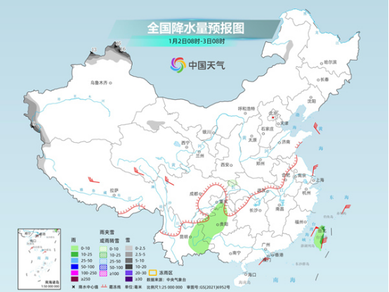今明天,新疆仍是降雪頻繁,西南部分地區(qū)也有降雨出沒,我國其他大部地區(qū)維持雨雪稀少的格局。