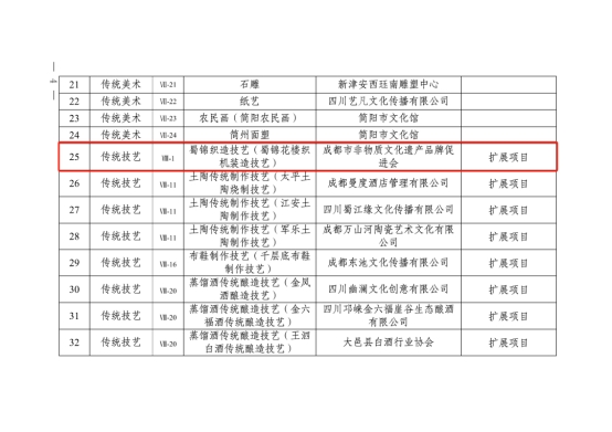 12月25日,成都市人民政府正式公布了《關(guān)于公布成都市第九批非物質(zhì)文化遺產(chǎn)代表性項(xiàng)目的通知》成府函〔2024〕119號(hào)文件,其中包括106個(gè)非遺代表性項(xiàng)目和7個(gè)現(xiàn)有市級(jí)非遺代表性項(xiàng)目的新增保護(hù)單位,蜀錦織造技藝(蜀錦花樓織機(jī)裝造技藝)成功入選。