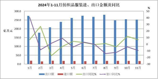 數(shù)據(jù)顯示,2024年1月至11月,中國紡織服裝累計(jì)出口2730.6億美元,比去年同期(下同)增長2%,其中紡織品出口1288.4億美元,增長4.6%,服裝出口1442.2億美元,下降0.2%。11月,中國紡織服裝出口251.7億美元,同比增長6.8%,環(huán)比下降1.2%,其中紡織品出口121.6億美元,同比增長9.5%,環(huán)比下降1.9%,服裝出口130.2億美元,同比增長4.3%,環(huán)比下降0.6%。