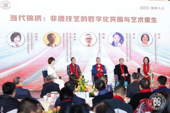 在“當(dāng)代錦繡:非遺技藝的數(shù)字化突圍與藝術(shù)重生”論壇上,浙江理工大學(xué)學(xué)術(shù)委員會(huì)副主任、中國(guó)現(xiàn)代織錦創(chuàng)立人李加林,香港科技大學(xué)(廣州)教授張康,浙江理工大學(xué)紡織品設(shè)計(jì)所主任周赳,中國(guó)工藝美術(shù)學(xué)會(huì)織錦專委會(huì)秘書長(zhǎng)沈蓓展開跨界對(duì)話。他們從絲織技藝傳承、AI技術(shù)應(yīng)用、色彩升級(jí)、東西方文化元素融合等多維角度,探討展望傳統(tǒng)絲織技藝的絲織技藝在新時(shí)代的無(wú)限可能,續(xù)寫絲綢文化的輝煌篇章。