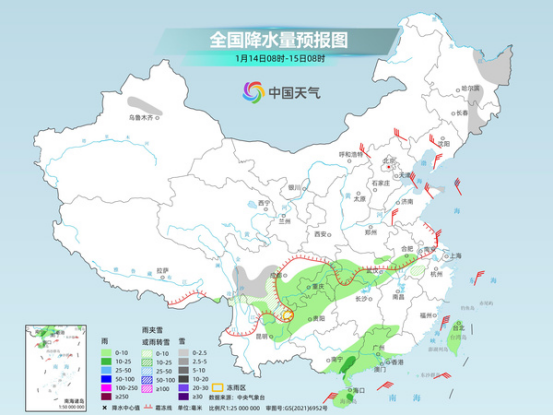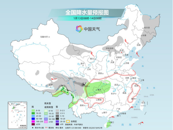 今明兩天(1月13日至14日),西南地區(qū)雨雪天氣將明顯增多,并逐漸向東擴展,后天起全國大部又將回歸晴朗干燥的天氣格局。同時,新一股較強冷空氣上線,中東部多地將迎來明顯降溫,部分地區(qū)降溫幅度可達8℃以上。