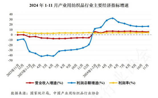 經(jīng)濟(jì)效益方面,根據(jù)國家統(tǒng)計局?jǐn)?shù)據(jù),2024年1-11月產(chǎn)業(yè)用紡織品行業(yè)規(guī)模以上企業(yè)的營業(yè)收入和利潤總額分別同比增長5.5%和16.4%,營業(yè)利潤率為4.2%,同比增加0.4個百分點,行業(yè)盈利狀況有所改善,但與疫情前相比仍有較大差距。